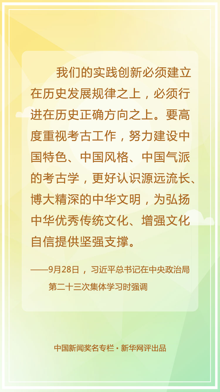 中共中央政治局9月28日下午就我国考古最新发现及其意义为题举行第二十三次集体学习。中共中央总书记习近平在主持学习时强调,要高度重视考古工作,努力建设中国特色、中国风格、中国气派的考古学,更好认识源远流长、博大精深的中华文明,为弘扬中华优秀传统文化、增强文化自信提供坚强支撑。习近平总书记的重要讲话在基层考古工作者中引发热烈反响,大家表示要牢记总书记的嘱托,不断加强考古工作和历史研究,加强考古成果和历