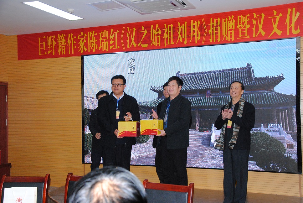 11月28日上午,在巨野县博物馆四楼学术报告厅成功举办巨野籍作家陈瑞红《汉之始祖刘邦》捐赠暨汉文化学术座谈会。 中央军委总政治部歌舞团原政委刘景智、中国秦汉史研究会秘书长赵凯、清华大学中国产业经济发展研究中心艺委会主任谢飞等20余名专家学者出席座谈会,多角度对《汉之始祖刘邦》及巨野汉文化资源挖掘利用进行学术交流。《汉之始